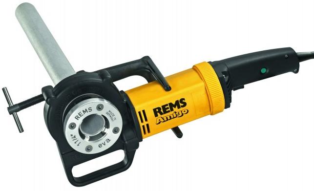 - Rems Амиго Сет. Электрический резьбонарезной клупп со сменными головками для трубной резьбы 1/8" – 1 1/4", 16 – 40 мм, болтовой резьбы 6 – 30 мм, 1/4" – 1". Для правой и левой резьбы. Привод, опорный бугель, не требующий технического обслуживания редуктор, надежный, мощный, универсальный двигатель 230 В, 50 – 60 Гц, 1200 Вт, с увеличением мощности посредством автоматической перестановки угольных щеток. Максимально потребляемая мощность до 1800 Вт. Правый / левый ход. Защита от перегрузки. С быстросменными резьбонарезными головками Rems Ева для конической резьбы ISO 7-1, EN 10226 (DIN 2999, BSPT) R правой и резьбы на электроизоляционных трубах согласно EN 60 423 М. В прочном стальном чемодане.
