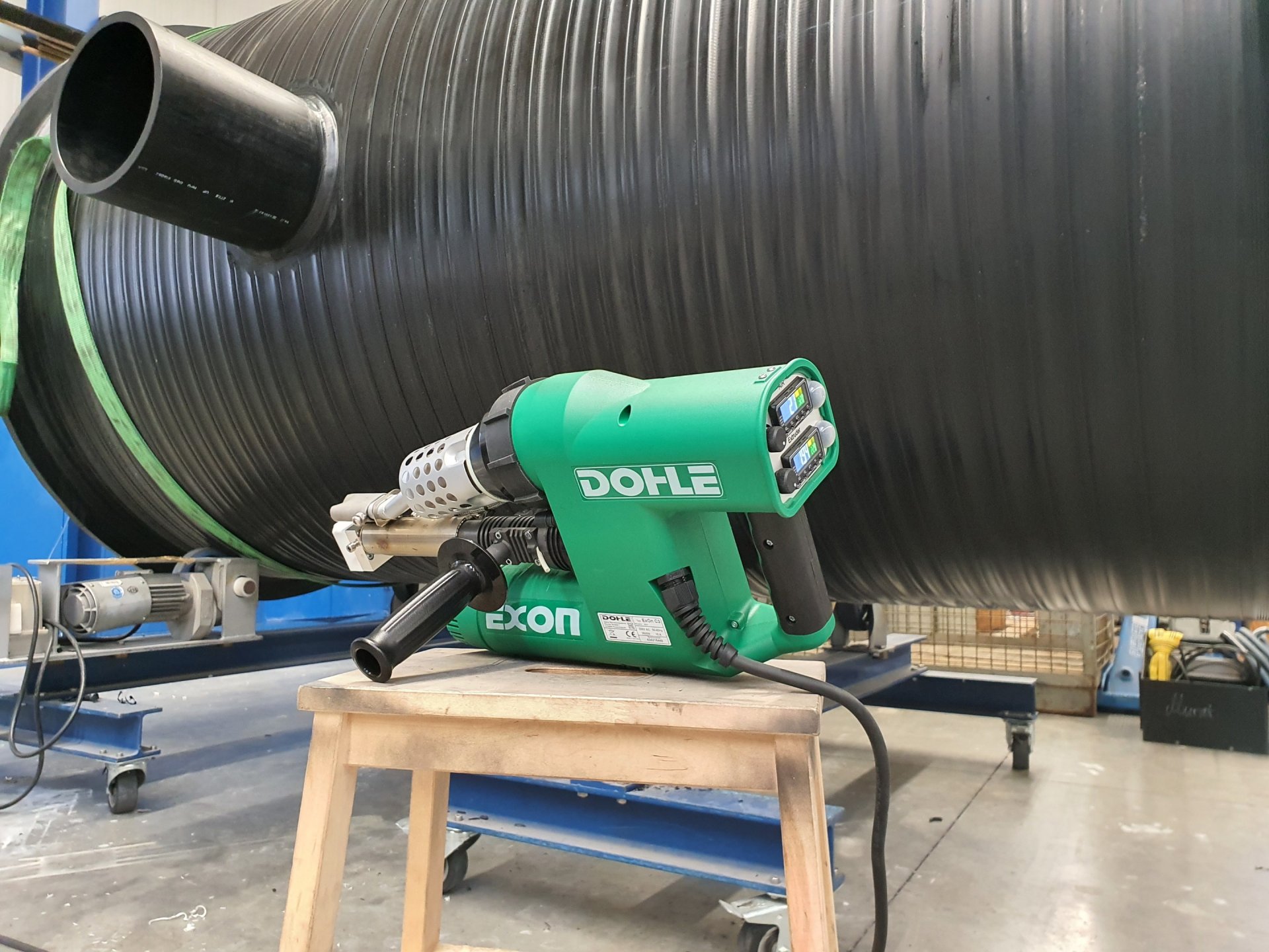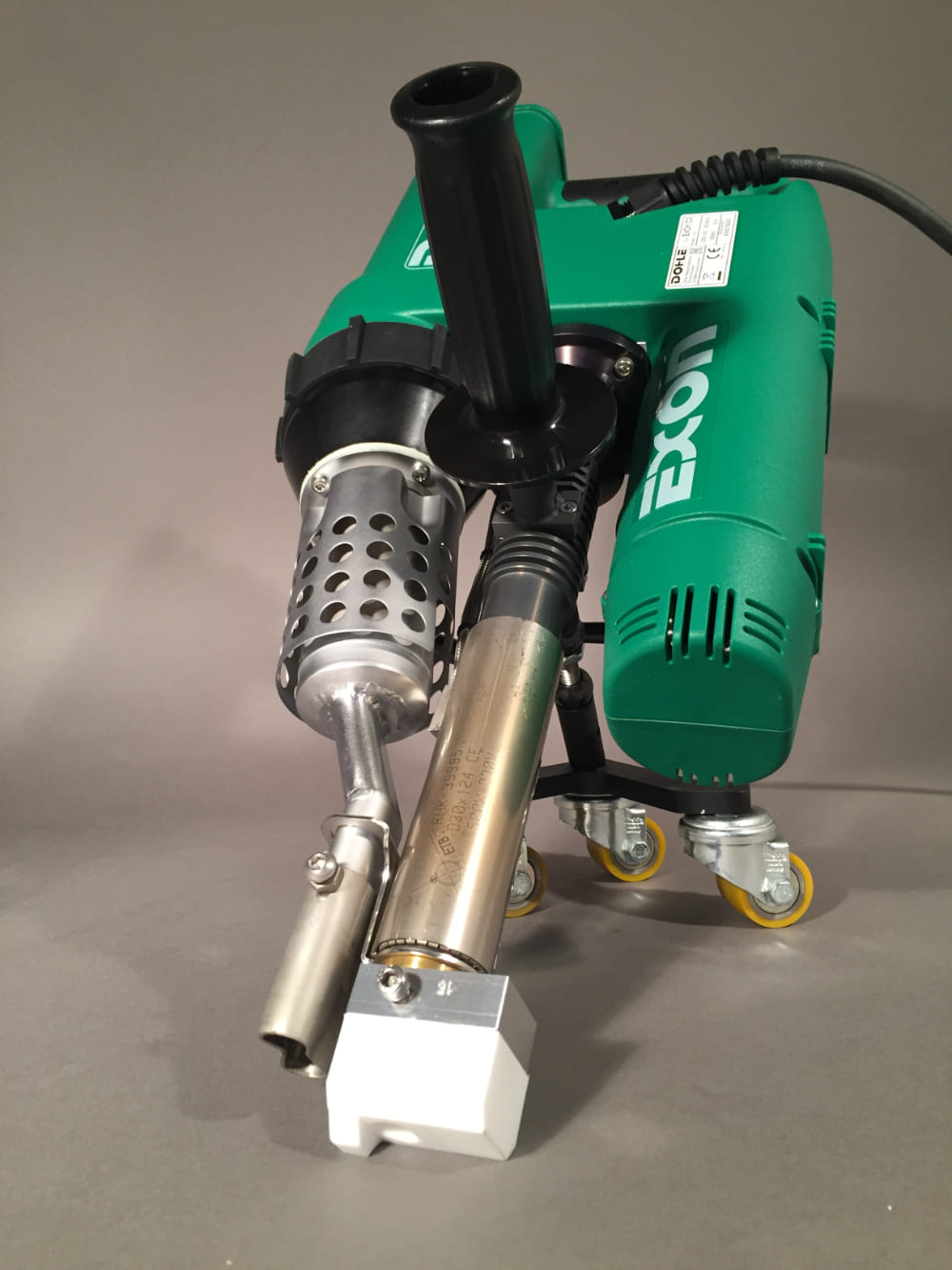 Инновационный, компактный и облегченный, высокопроизводительный ручной сварочный экструдер ExOn C3 Compact от производителя Dohle (Германия) имеет раздельную систему нагрева экструзионного расплава и свариваемого материала, благодаря чему способен сваривать такие материалы, как: ПВХ, ПВДФ, ПП и ПЭ. Два раздельных цифровых контроллера для регулировки и отслеживания заданной и фактической температуры экструзионного расплава и температуры воздуха для прогрева свариваемого материала. Оборудован бесщеточными, не требующими специального обслуживания, приводами воздушной турбины и шнека, имеет низкий уровень шума и вибрации при работе. Увеличен воздушный поток, который теперь можно регулировать. Производитель уменьшил габариты и вес за счет нестандартной оригинальной компоновки, а также добавил светодиодную подсветку рабочей зоны в базовую комплектацию. В качестве дополнительных опций возможна комплектация передвижной кареткой для удобства сварки угловых швов, а также скобой для подвески через балансир на трос для облегчения продолжительной работы на производстве.