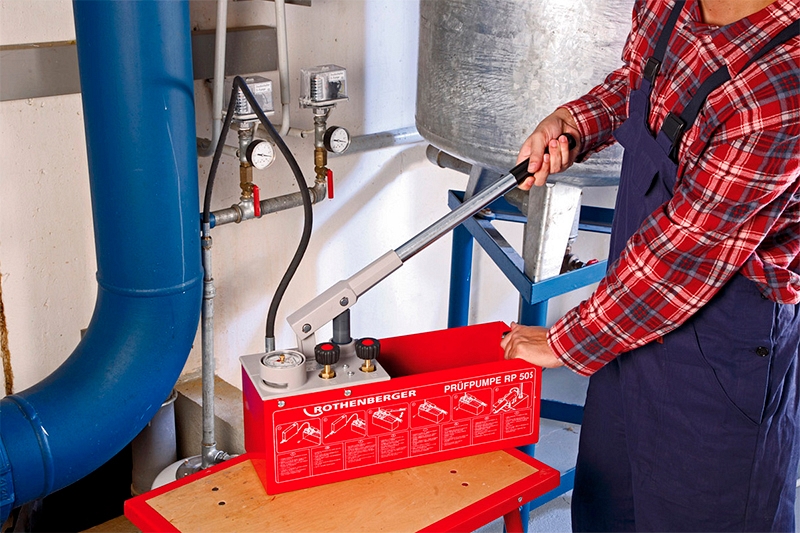 Опрессовочный насос Rothenberger RP 50-S - прочный, легкий и удобный ручной гидравлический опрессовщик предназначен для точного испытания давлением до 60 бар на герметичность с помощью воды или масла систем водоснабжения, отопления, канализации и резервуаров в жилых и промышленных помещениях, при изготовлении промышленных напорных резервуаров в котлостроении, а также при заполнении солнечных батарей.