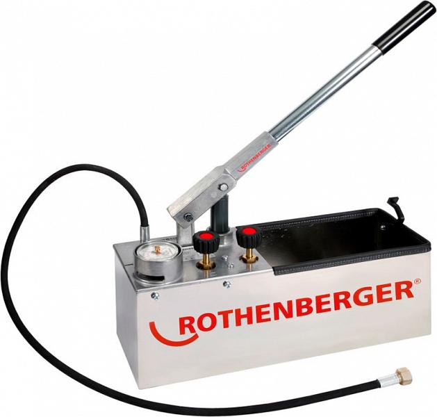 Опрессовочный насос Rothenberger RP 50-S Inox - прочный, легкий и удобный ручной гидравлический опрессовщик предназначен для точного испытания давлением до 60 бар на герметичность с помощью воды или масла систем водоснабжения, отопления, канализации и резервуаров в жилых и промышленных помещениях, при изготовлении промышленных напорных резервуаров в котлостроении, а также при заполнении солнечных батарей.