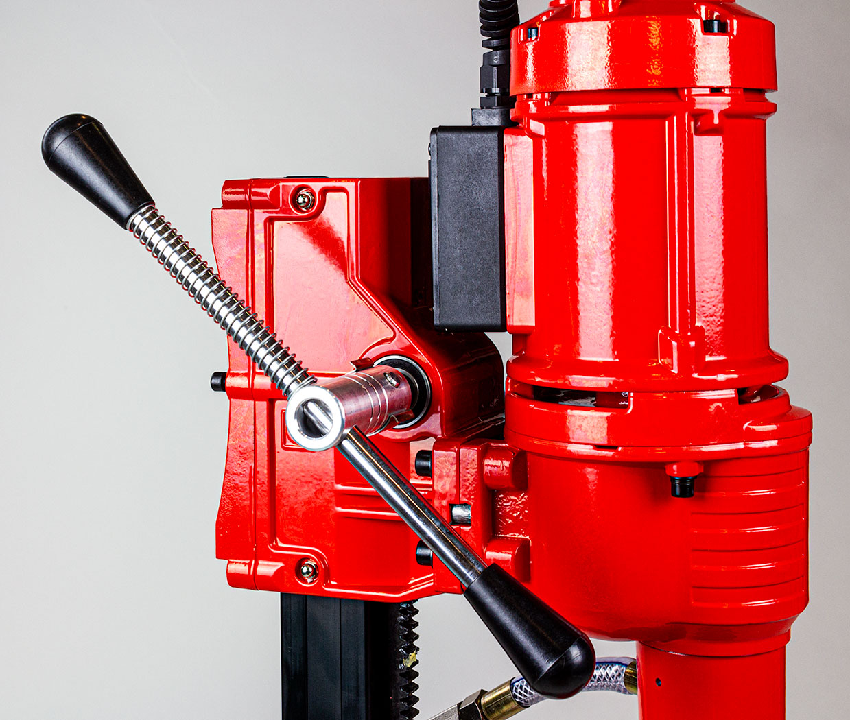 - Каретка перемещается по стойке вручную через пару "шестерня-зубчатая рейка", имеет регулируемые уголки из латуни, которые обеспечивают плавное скольжение и легкую подачу алмазной коронки