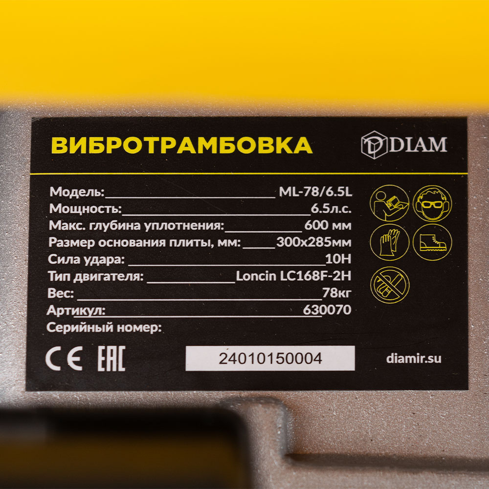Вибротрамбовка Diam ML-78/6.5, оснащённая бензиновым двигателем, обеспечивает силу удара до 1000 кг, что делает её мощным инструментом для уплотнения грунта. Удобство в работе достигается за счёт эргономичной ручки с вынесенными на неё органами управления. Данная модель применяется для эффективного уплотнения всех видов сыпучих и несвязных грунтов: песка, гравия, щебня, а также глины и суглинка. Её компактность и мощность позволяют результативно работать в труднодоступных местах, таких как траншеи, отмостки, у оснований столбов и колодцев.